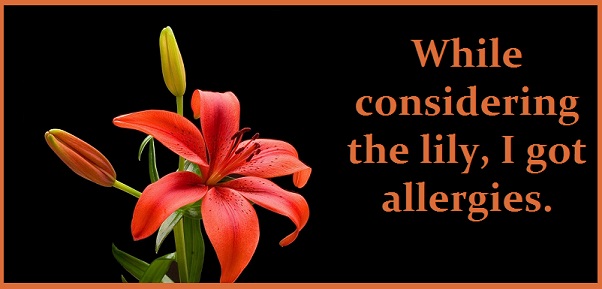 October 25, 2013 Oct25 JONATHOTS, JR.! (Number 296) If you tell an American audience to “consider the lily,” they will inform you that they are allergic to flowers. Share this: Click to share on LinkedIn (Opens in new window) LinkedIn Click to email a link to a friend (Opens in new window) Email Click to share on Pinterest (Opens in new window) Pinterest Click to share on Tumblr (Opens in new window) Tumblr Click to print (Opens in new window) Print Click to share on Pocket (Opens in new window) Pocket Click to share on WhatsApp (Opens in new window) WhatsApp Click to share on X (Opens in new window) X Click to share on Reddit (Opens in new window) Reddit Like Loading...